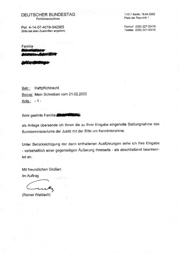 [ home | 10 Punkte | Offener Brief | Hilfe | Sie haben das wohl auch nicht erwartet | Schicksal | Politik | Arbeitsaltag Dt. Bundestag | Staatsziel Tierschutz ... | Petition | Tatsachenbericht | CTG | Gutachten | Pflegestufen | Verjährungsfristen | Adressen | Literatur | Links | Presse | Rechtshinweis | Gästebuch | Impressum | Kontakt ]